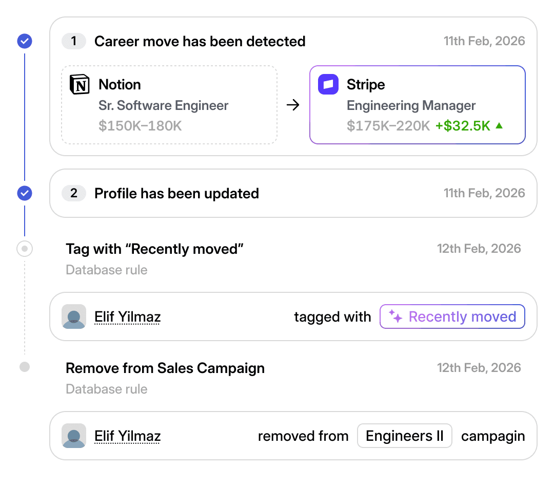 Jellie detects career moves, title changes, and relocations the moment they happen. Then auto-updates records, applies smart tags, and adjusts campaign eligibility. No stale data. No manual cleanup.