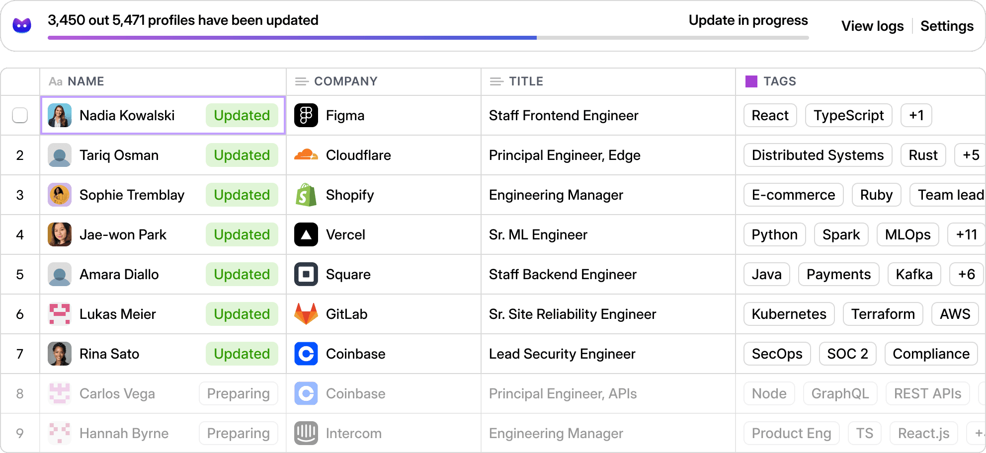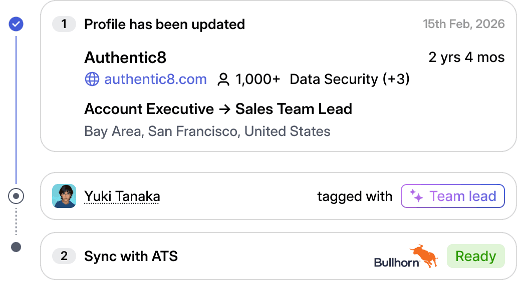 Every enriched field, every new tag, every career move — pushed directly to Bullhorn, JobAdder, Loxo, or wherever you work. No exports. No imports. No "I'll update it later."