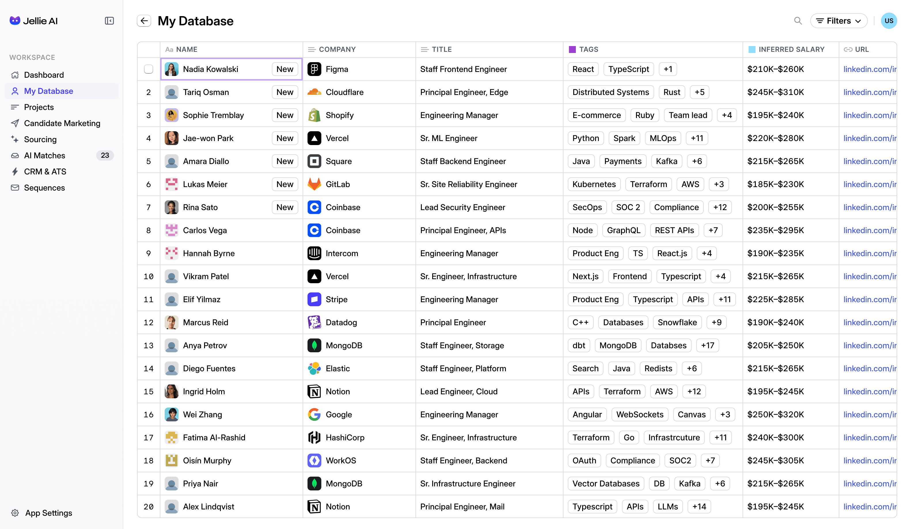 Jellie pulls data from LinkedIn, GitHub, Crunchbase, arXiv, and dozens more sources. Enriching every profile with company details, funding stage, tech stack, and career signals you'd never find manually.